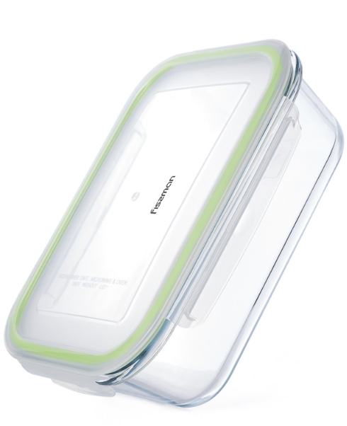 Der Behälterkörper besteht aus dickem, hitzebeständigem Glas. Spezielle Markierungen auf dem Boden des Behälters bestätigen, dass der Glasbehälter sicher in Backofen und Mikrowelle verwendet werden kann. Für eine zuverlässige Dichtigkeit sorgt das robuste, transparente Design des Kunststoffdeckels mit 4 Verschlüssen (Clips) und einer integrierten hochwertigen grünen Silikondichtung. Dies garantiert, dass Flüssigkeiten nicht auslaufen und Lebensmittel länger frisch bleiben.