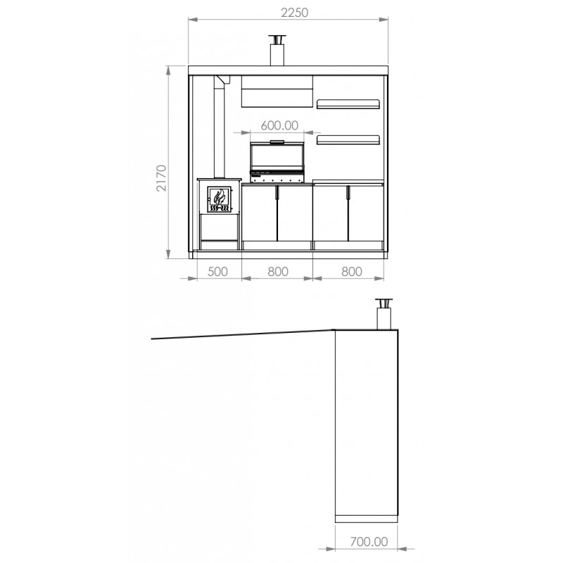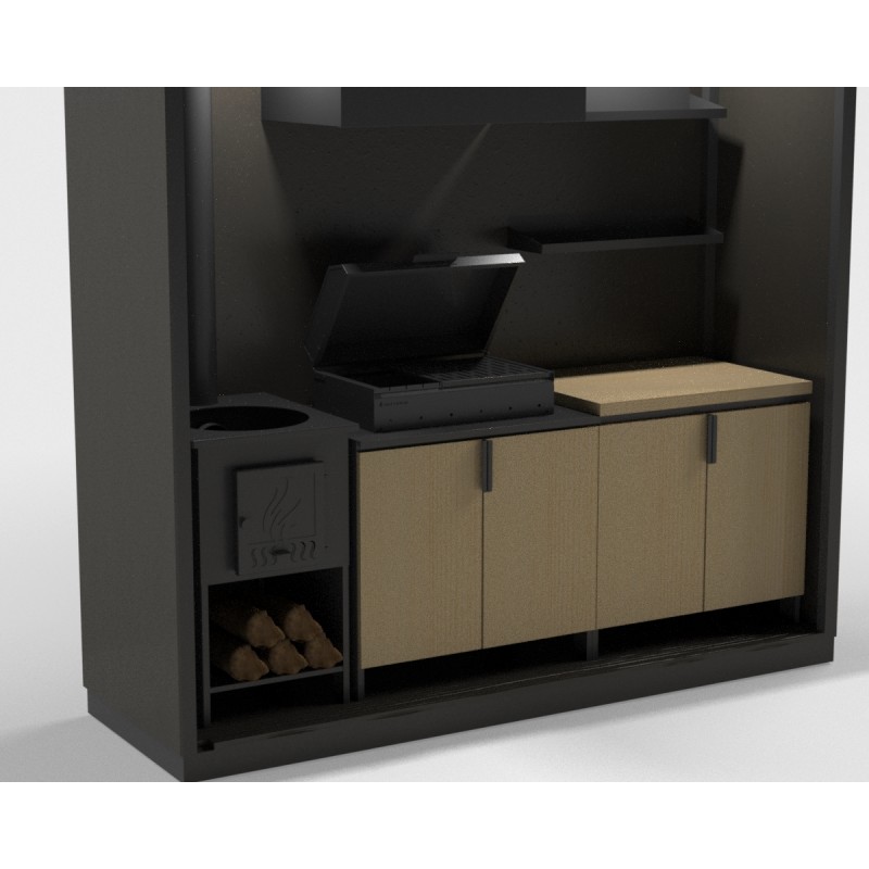Integriertes elektrisches System: Integrierter Rauchabzug, LED-Beleuchtung und 220V-Steckdose zum Anschluss elektrischer Geräte.