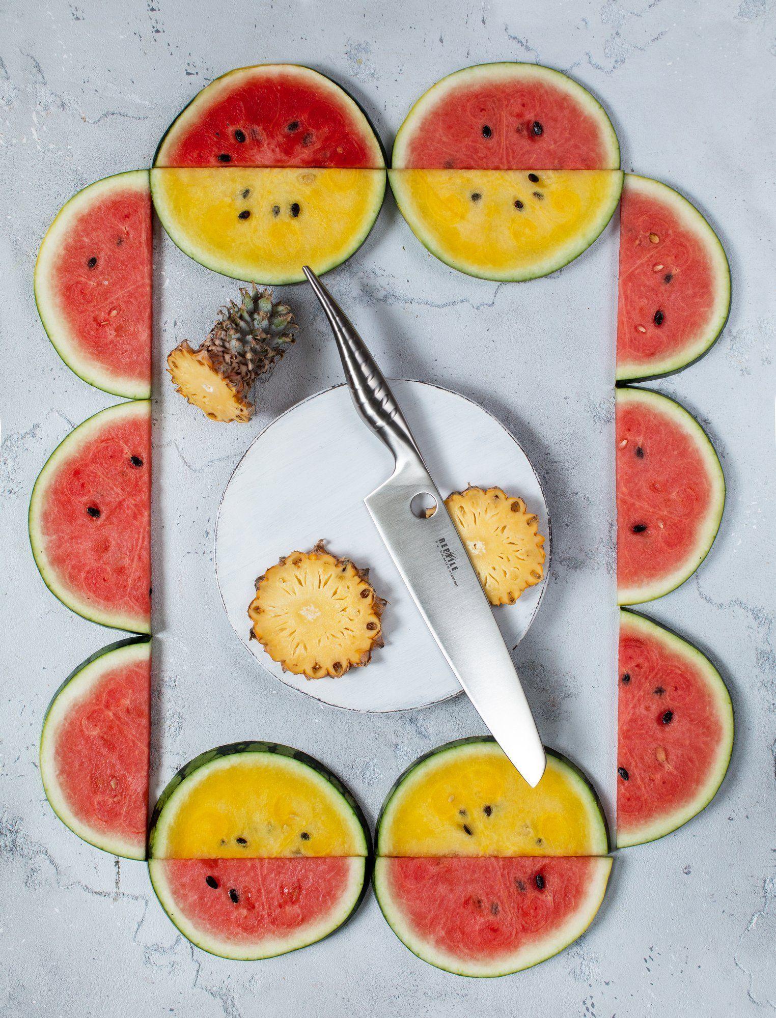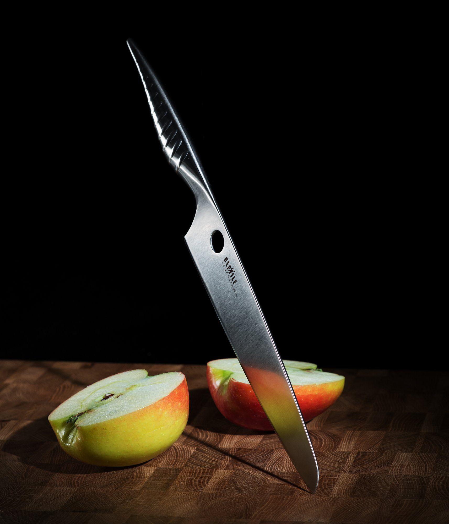 Kochmesser mit origineller moderner Klinge kombiniert etwas zwischen einem klassischen europäischen Kochmesser und einem japanischen Kochmesser – Santoku. Wie beim japanischen Pendant ist die Spitze des modernen Kochmessers nach unten gerichtet, was ein energiesparendes Schneiden von Speisen ermöglicht. Ein gerippter, rutschfester, patentierter Griff und ein markantes Reptilauge an der Klinge sorgen für einen angenehmen Halt in der Hand.