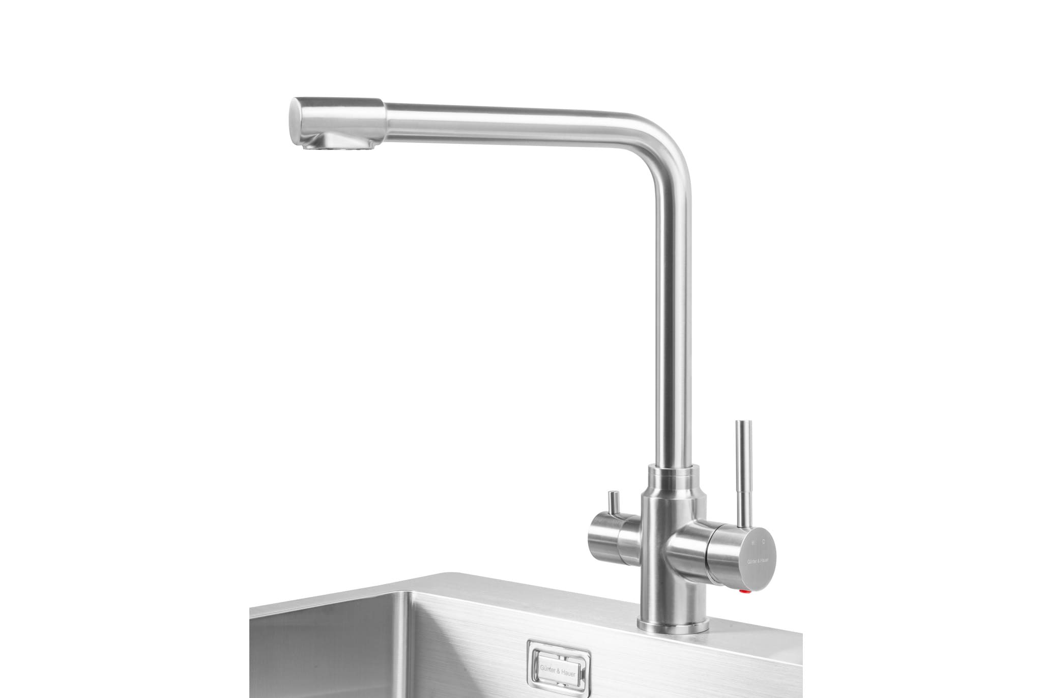 Küchenarmatur mit Zweihebelbedienung zur Abgabe und Regulierung von normalem und gefiltertem Trinkwasser.