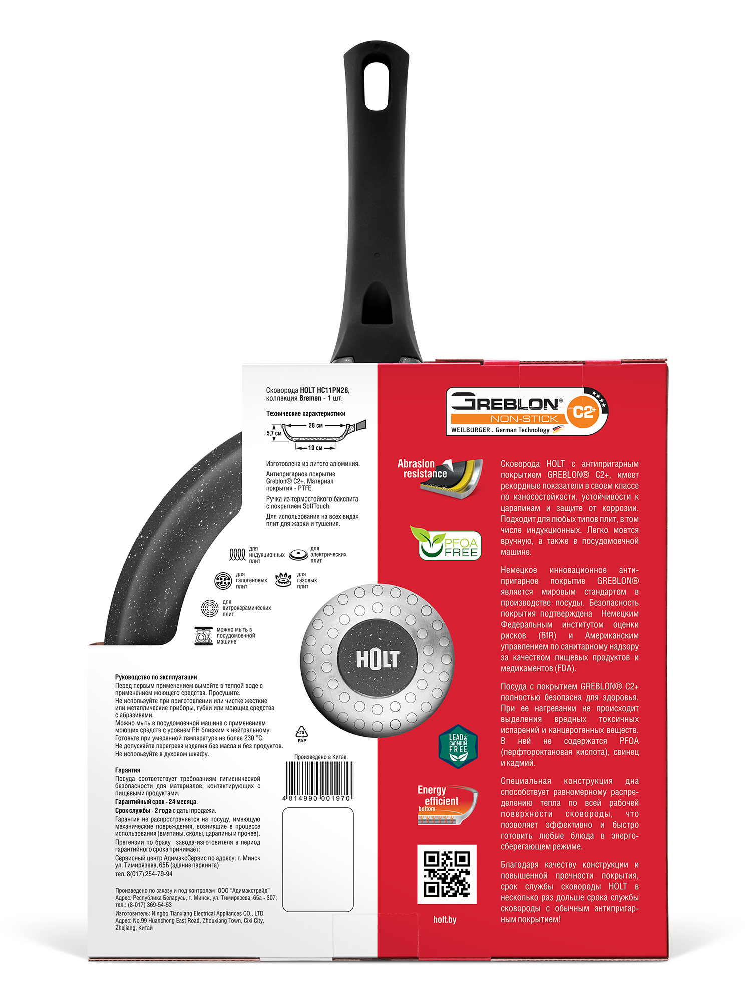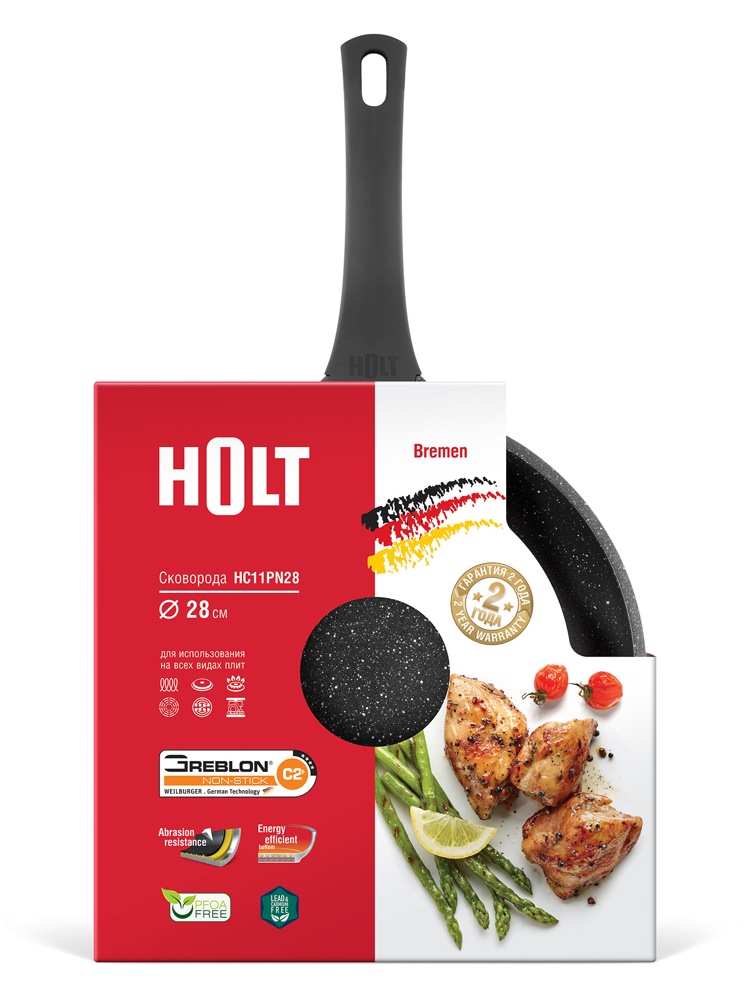 Entdecken Sie mit der HOLT-Pfanne, die mit einer der neuesten und haltbarsten Technologien – der Greblon-Beschichtung – versehen ist, das Vergnügen des Kochens neu. Diese in Deutschland entwickelte Beschichtung ist eine Verbindung aus Fluorpolymeren und extraharter Keramik, die sich durch eine außergewöhnliche Kratz- und Abriebfestigkeit auszeichnet. Vergessen Sie schnell zerkratzte und anbrennende Pfannen!