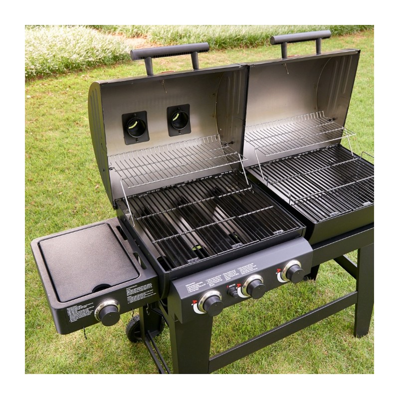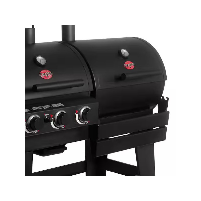 Der Char-Griller Double Play ermöglicht es Ihnen, sowohl Gas- als auch Holzkohlegrillen gleichzeitig zu genießen – eine Seite ist für Gas, die andere für Holzkohle, und ein zusätzlicher Seitenbrenner ermöglicht die Zubereitung von Saucen, Beilagen oder das Anbraten vor dem Grillen.