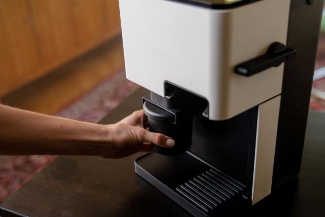 - Mahlen: Setzen Sie den “Click Cup” auf der linken Seite ein. Das Gerät mahlt Ihre gewählten Kaffeebohnen direkt hinein.