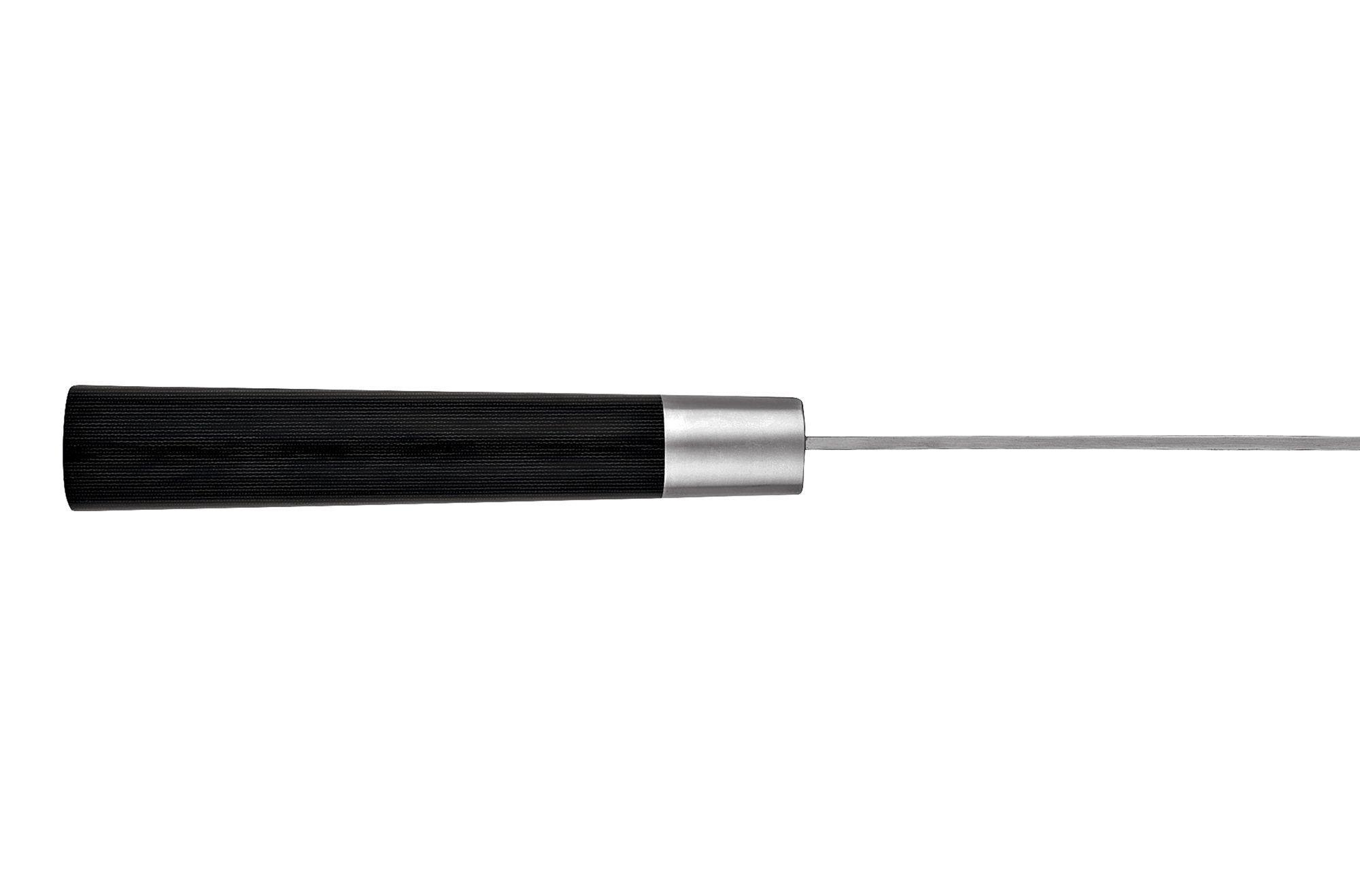Der handgeschmiedete Kohlenstoffstahl AUS-8, der als Material für die Klinge verwendet wird, ist äußerst langlebig und hält die Schneide perfekt – die Hauptvorteile für ein professionelles Küchenwerkzeug. Für ein ultrascharfes Schärfen wird das Messer von Hand auf einem japanischen Schleifstein mit 5000er Körnung auf Wasserbasis geschliffen. Der verschleißfeste Griff des Messers besteht aus Micarta – einem Material, das sowohl hohen als auch niedrigen Temperaturen eine erhöhte Beständigkeit bietet.