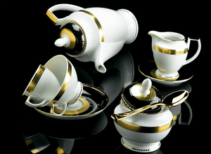 - Material – Kaolin (50-55%), Quarzbeimischung 20%, Feldspat 30% Goldornament mit 22 Karat Gold