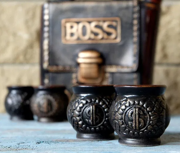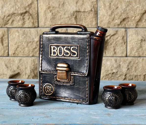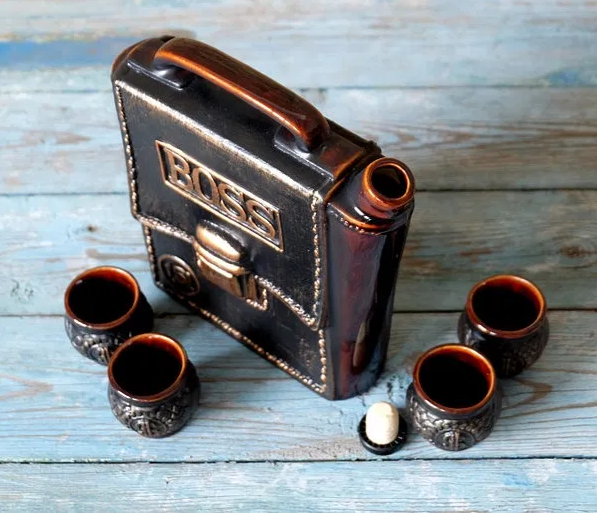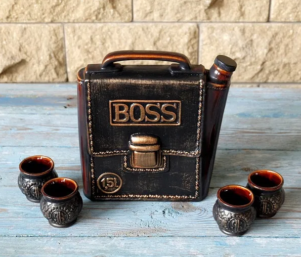 Das Set besteht aus einer Keramikkaraffe in Form einer Aktentasche mit der soliden Aufschrift “BOSS” und vier passenden Schnapsgläsern. Dieses Set wird zu einer ausgezeichneten Zierde für jedes Männerbüro oder jede Hausbar, ergänzt die Sammlung und verleiht dem Raum Exklusivität.