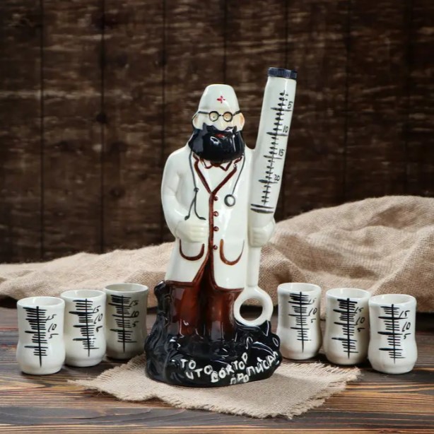 Das Set besteht aus einer Karaffe in origineller Form – einer Arztfigur, die eine riesige Spritze hält – und sechs passenden Gläsern, die mit einer Messskala verziert sind. Aufgrund seines einzigartigen Aussehens wird dieses Set nicht nur zu einem praktischen Gefäß für die Bewirtung von Gästen, sondern auch zu einem außergewöhnlichen Einrichtungsdetail oder Gesprächsthema bei einer Party.
