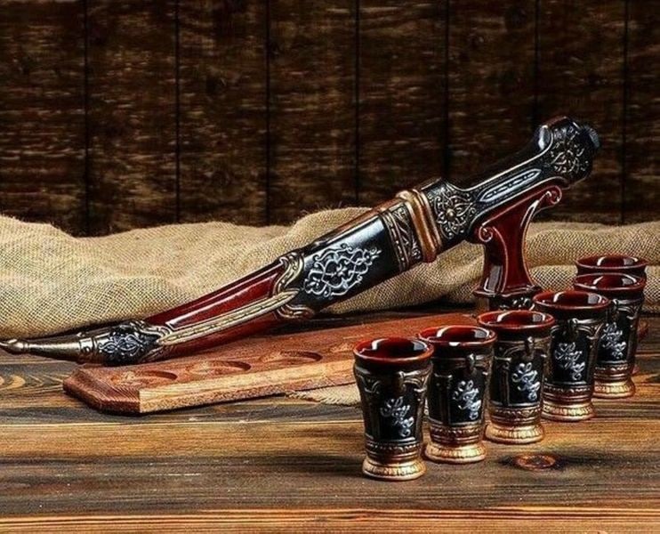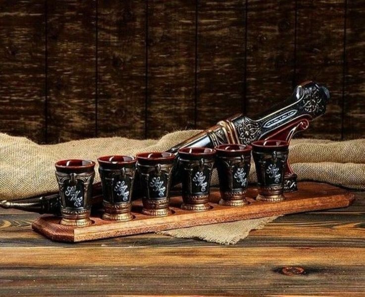 Beeindruckendes orientalisches Design Das Hauptelement des Sets ist eine Keramikkaraffe in Form eines Dolches im orientalischen Stil, verziert mit einer reichen künstlerischen Gravur. Zusammen mit sechs stilistisch passenden Schnapsgläsern wird sie elegant auf einem speziellen Holzständer platziert, was eine stimmige und luxuriöse Komposition ergibt.