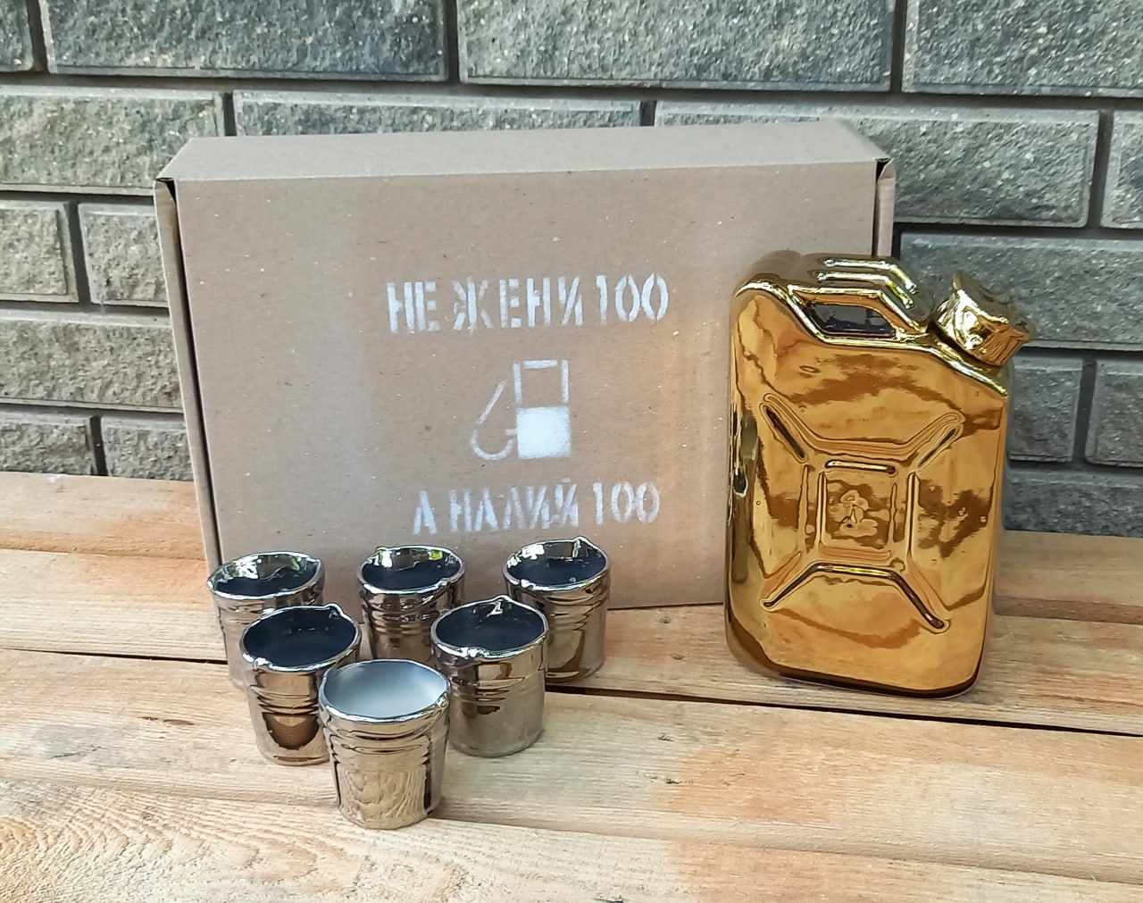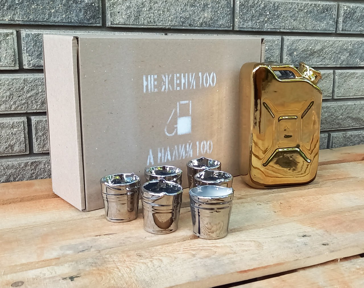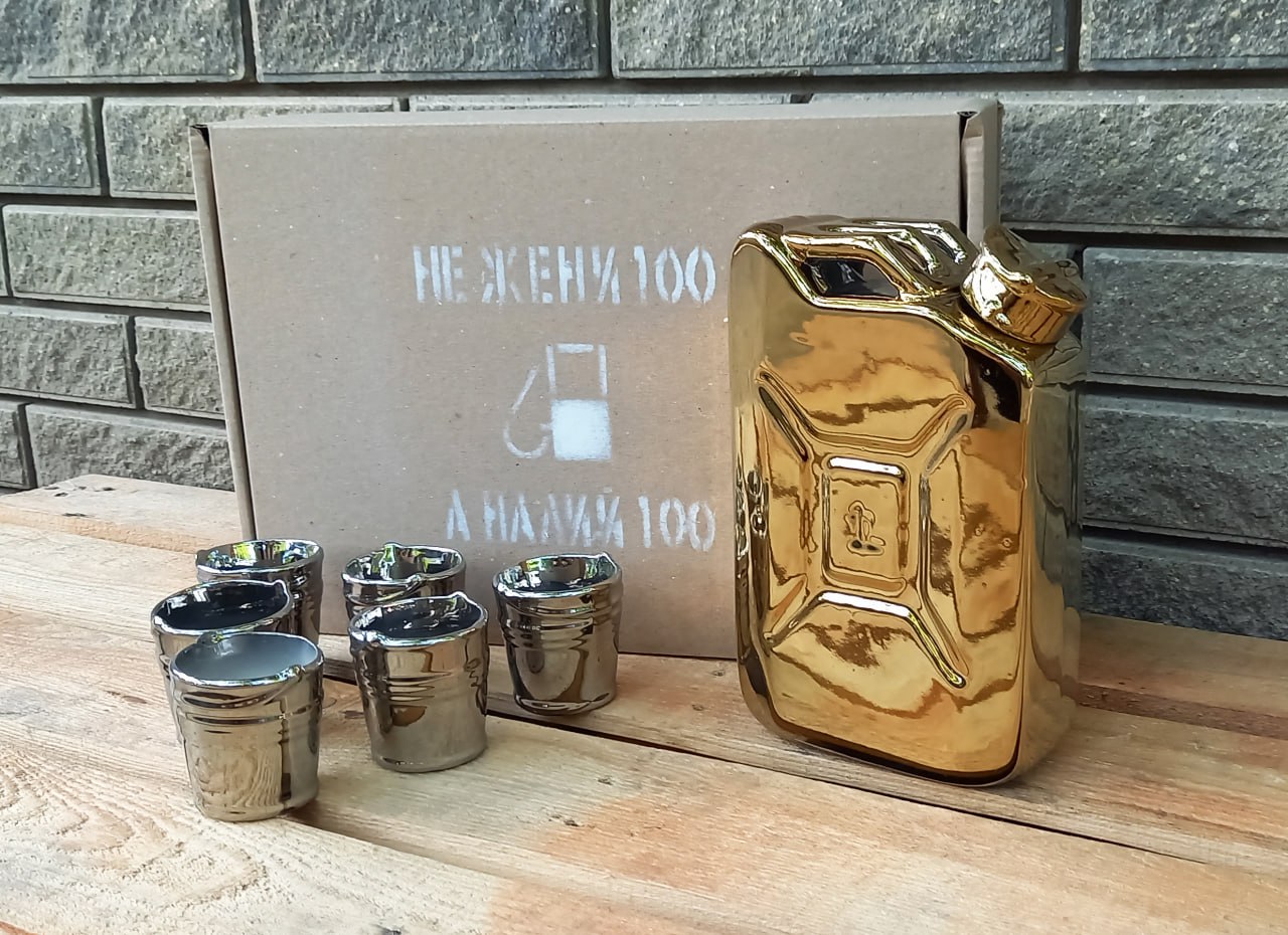 Das Set besteht aus einer Keramikkaraffe, die einem echten Kanister ähnelt, und sechs passenden Schnapsgläsern in Form kleiner Eimer. Die Außenseite der Karaffe ist mit einer speziellen Beschichtung versehen, die Damaszener Stahl imitiert und einen luxuriösen goldenen Effekt erzeugt. Ein bequemer Griff und ein origineller Deckel verleihen dem Produkt Authentizität.