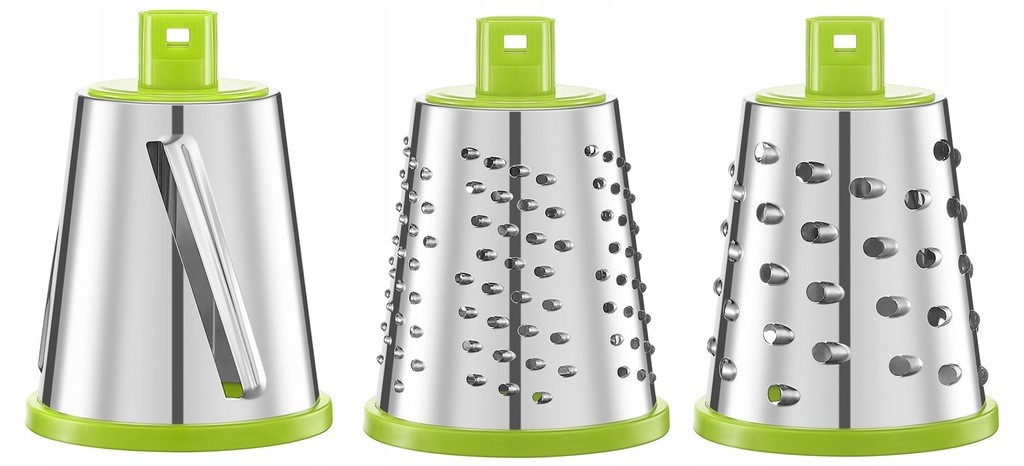Im Lieferumfang sind 3 austauschbare Edelstahlwalzen enthalten (fein, grob, Scheiben).