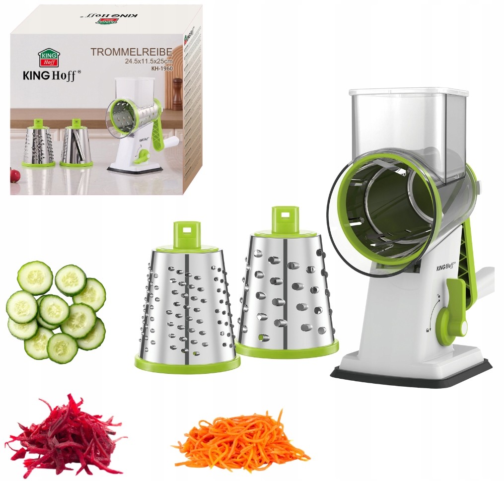 Erleichtern Sie Ihre tägliche Essenszubereitung mit der KING Hoff KH-1960 Hand-Schneidemaschine/Reibe! Dies ist ein multifunktionales Werkzeug, das Ihnen hilft, Gemüse, Obst und Käse schnell und mühelos zuzubereiten. Ideal für Küchen zu Hause, in Restaurants, Kantinen und für jeden Kochbegeisterten!