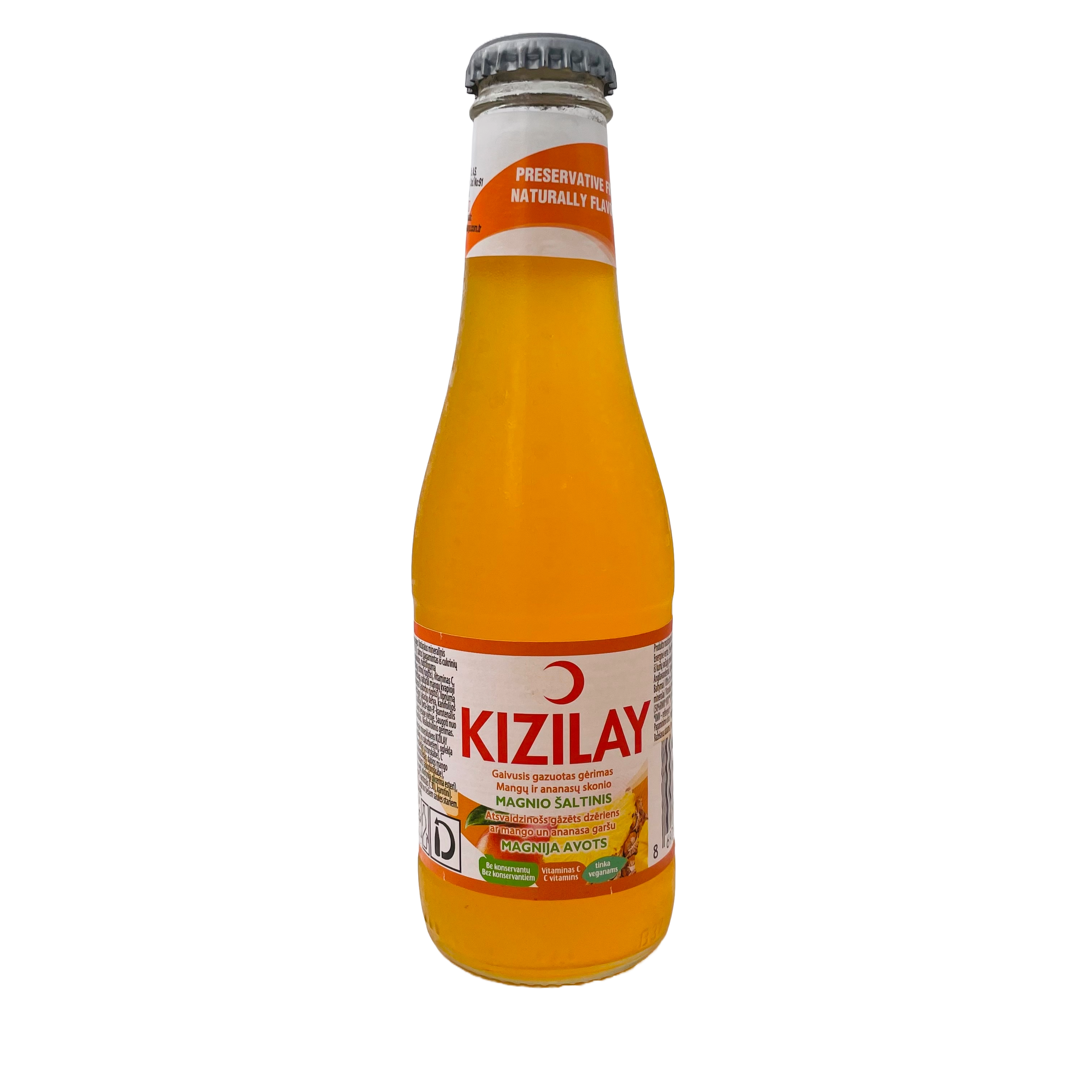 Zutaten: natürliches Mineralwasser KIZILAY (92 %), Zucker (aus Zuckerrüben), Kohlendioxid, Säureregulator (Zitronensäure), Vitamin C, Ananasaroma, natürliches Mangosaroma, Antioxidans (Ascorbinsäure), Stabilisatoren (Arabische Gummiharz, Glycerinester von Kolophonium), Farbstoffe (Beta-Apo-8′-Karotenal (C30), Karotine).