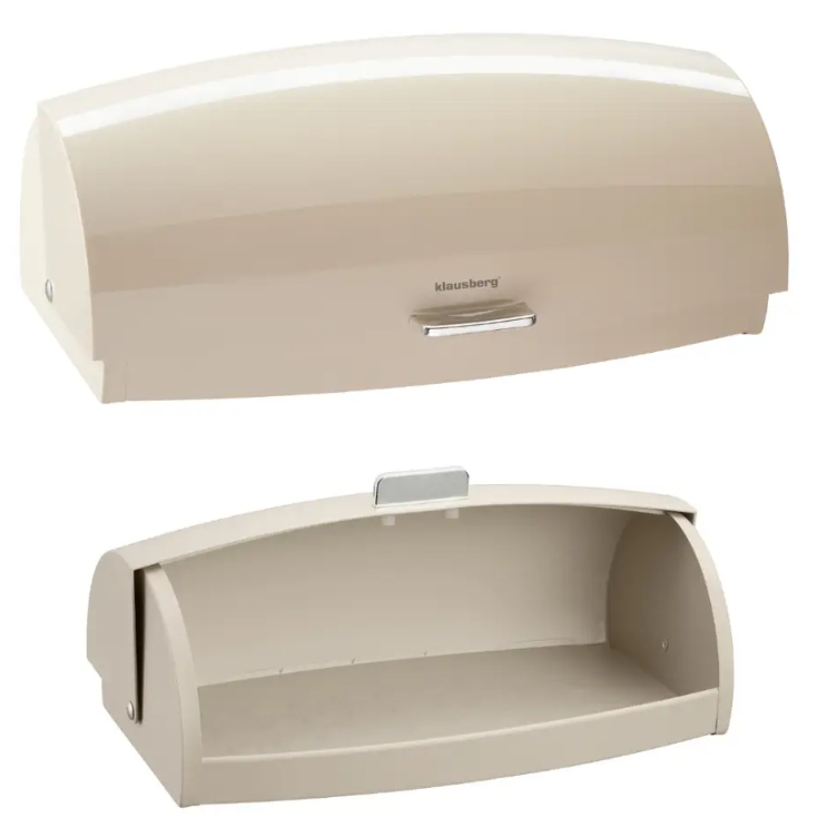 Das Gehäuse des Brotkastens ist aus robustem, lackiertem Metall gefertigt, was für Langlebigkeit sorgt, während der sanft abgerundete Deckel aus Polystyrol (PS) besteht. Dies ist ein leichtes, hygienisches und kratzfestes Material. Ein praktischer ergonomischer Griff und ein leichtgängiger Öffnungsmechanismus garantieren eine komfortable tägliche Nutzung.