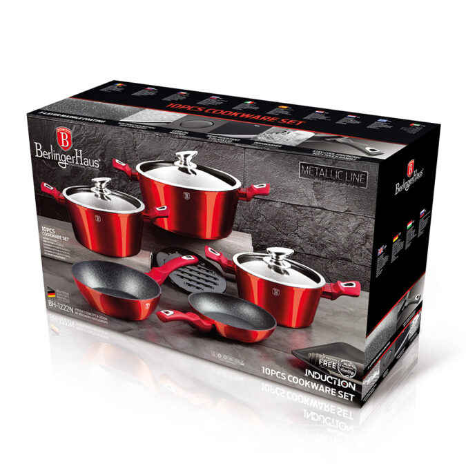 - Verwenden Sie beim Waschen keine Metallscheuermaschine oder Metallutensilien zum Kochen, um eine Beschädigung der Antihaftbeschichtung und der metallischen Farbe des Kochgeschirrs zu vermeiden.