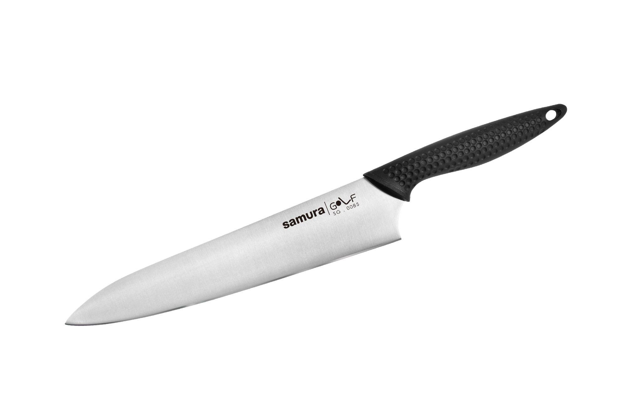 Eine breite Klinge aus speziellem AUS-8-Messerstahl mit einer für Japan typischen Geometrie – ein spitz zulaufender Kolben – eignet sich hervorragend für vielfältige Küchenarbeiten: Schneiden, Hacken, Hacken. Trotz seiner Größe wirkt die Klinge nicht massiv: Die Feinheit des Kolbens verleiht dem Chef Samura Golf Anmut.