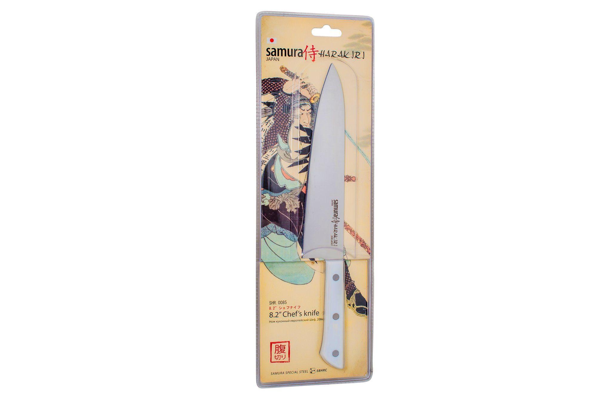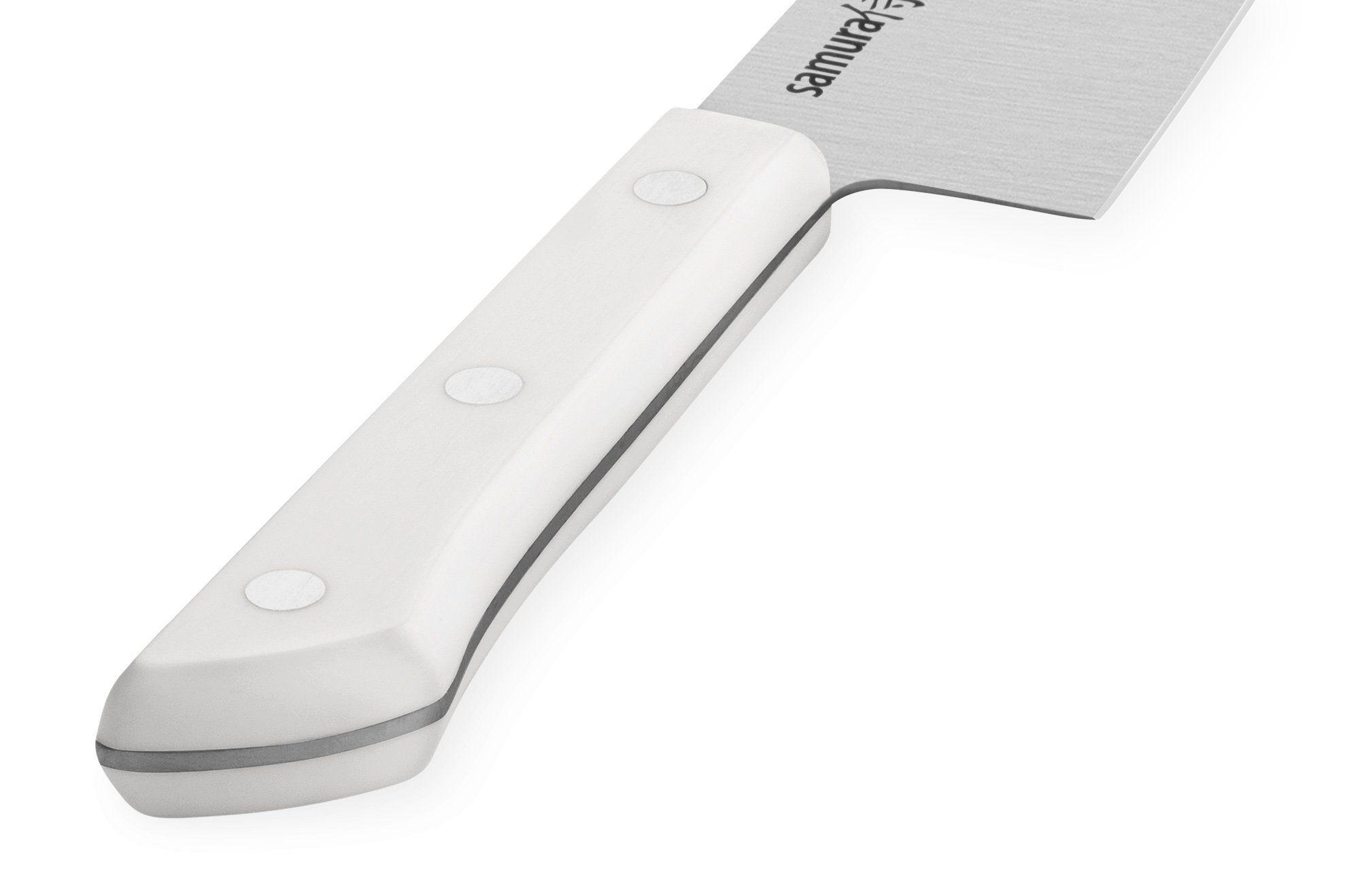 Der europäische Koch aus der Samura Harakiri-Kollektion wird Sie mit der Rasiermesserschärfe seiner breiten Klinge, der Ergonomie des weißen Kunststoffgriffs und der breitesten Funktionalität begeistern.