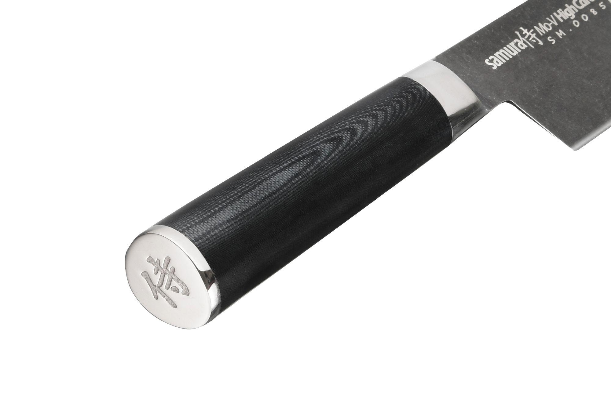 Die Klinge des MO-V Stonewash Profi-Kochmessers geht fließend in einen Metallkropf über. Es ist dieses Element, das beim Kochen den Kontakt der Hand mit Lebensmitteln verhindert und auch die Fugen zwischen Klinge und Griff zuverlässig schließt. Das Vorhandensein eines Polsters verhindert das Eindringen von Bakterien und anderen Mikroorganismen in die Löcher und gewährleistet die notwendige Arbeitshygiene. Aus diesem Grund wird die MO-V-Serie für die professionelle HoReCa-Branche empfohlen.