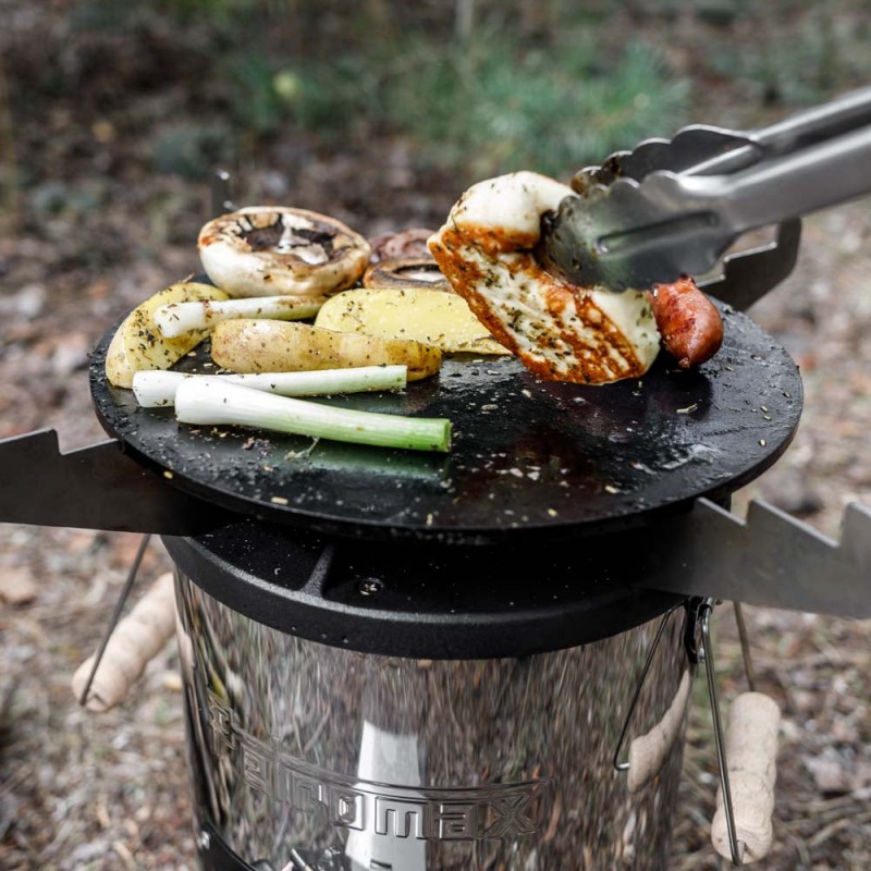 Die Kochplatte ist ein hervorragendes Zubehör für den Rocket Stove. Auf der Platte können Sie problemlos saftiges Fleisch, Fisch und Gemüse braten. Dank des Brennraums des Rocket Stove heizt sie schnell auf – das Metallkreuz fördert die Luftzirkulation, damit sich die Wärme gleichmäßig verteilt. Nach dem Erhitzen der Platte entsteht ein natürlicher Antihaft-Effekt und Sie erhalten einen köstlichen Geschmack von gebratenem Essen.