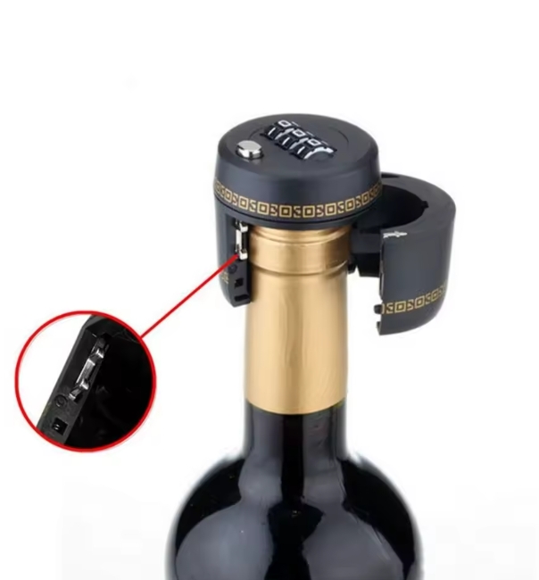 Entdecken Sie eine innovative Lösung zum Schutz Ihres Weins und anderer Getränke – kombiniertes Codeschloss für Flaschen. Dieser elegante schwarze Verschluss mit diskretem goldenem Aufdruck verschönert nicht nur die Flasche, sondern bietet ihr auch zusätzliche Sicherheit und hilft, die Qualität des Getränks länger zu bewahren.
