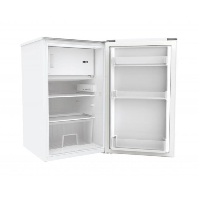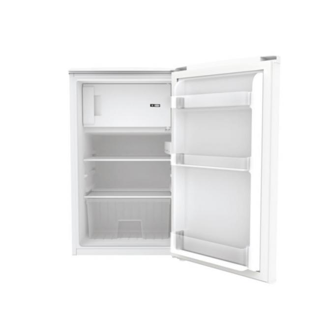 Kompakter, freistehender eintüriger Kühlschrank mit integriertem Gefrierfach. Ideal für kleine Küchen, Gartenhäuser, Büros oder als zusätzlicher Kühlschrank im Haus.