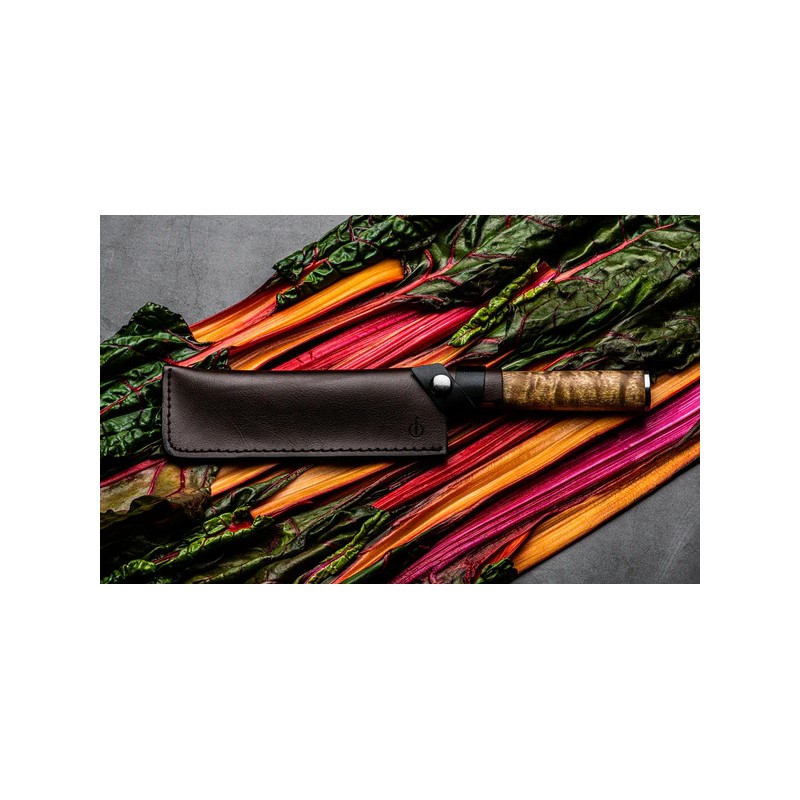 Ein Lederetui für Gemüseschneidemesser gewährleistet den sicheren Transport oder die Aufbewahrung des Messers.