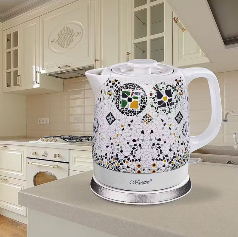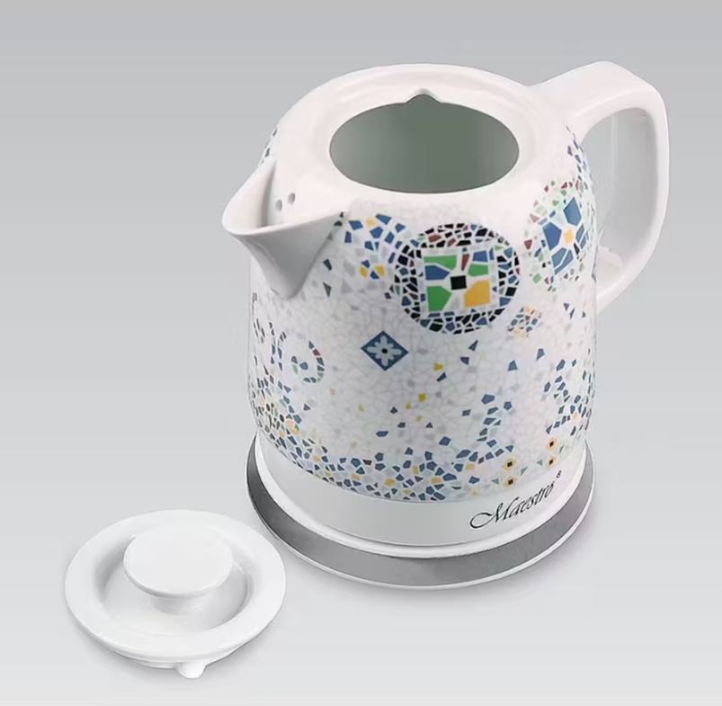 Der elektrische Wasserkocher Maestro MR-068 ist mehr als nur ein Gerät zum Erhitzen von Wasser. Er ist ein auffälliges und stilvolles Küchenelement, dessen Keramikgehäuse mit einem einzigartigen, farbenfrohen Mosaikmuster verziert ist. Dieser Wasserkocher wird nicht nur ein zuverlässiger Helfer sein, sondern auch ein originelles Detail der Inneneinrichtung, das Ihrer Küche Lebendigkeit und Charakter verleiht.