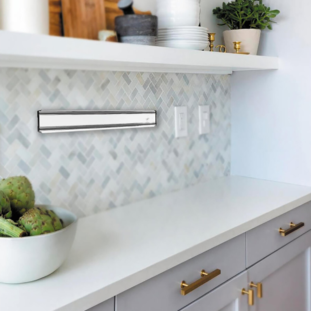 Dieser 41,5 cm lange Halter ist aus robustem, hochwertigem Metall gefertigt und zeichnet sich durch ein elegantes, minimalistisches Design aus, das zu jeder Kücheneinrichtung passt. Er verfügt über zwei starke Magnetleisten, die einen sicheren Halt gewährleisten und selbst größere Messer fest an Ort und Stelle halten.