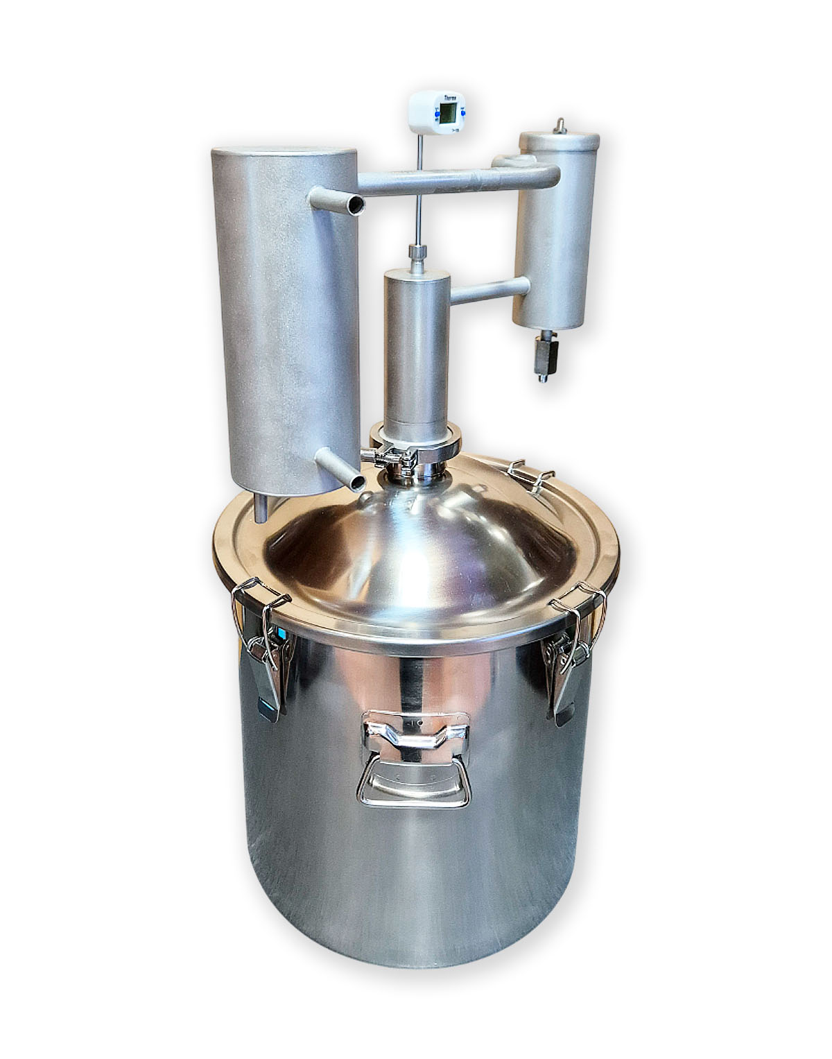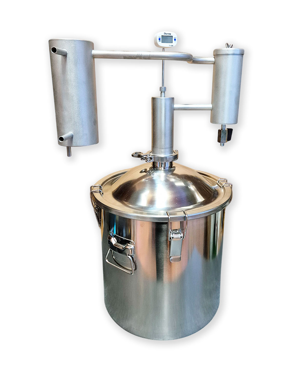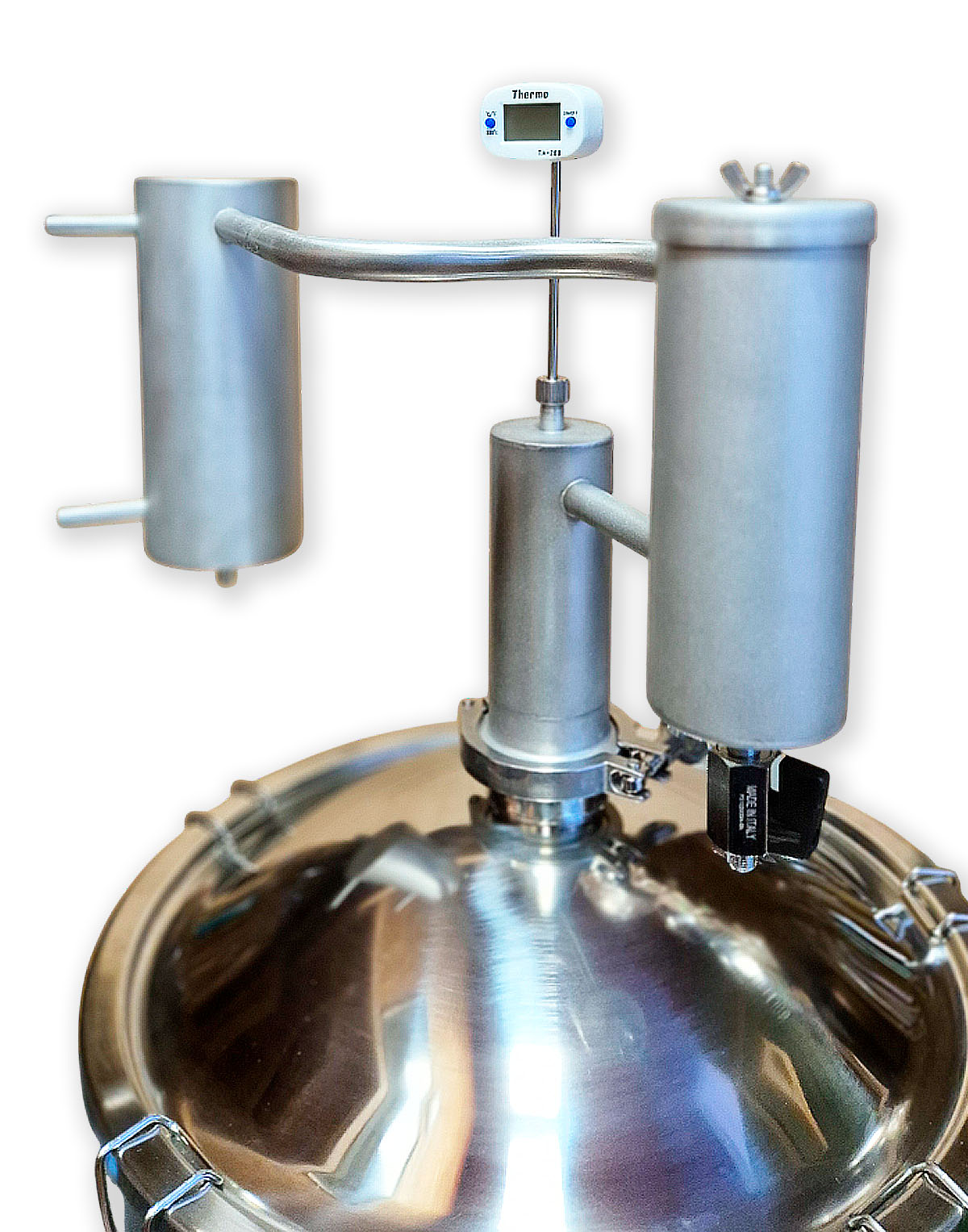 • Eigenständige Modifikationsmöglichkeit – 2″-Klemmverbindung (Schellenanschluss) gibt die Möglichkeit, andere Komponenten für die Destillation zu verwenden, z.B., eine zusätzliche Zarge, ein Diopter oder einen Alembik;