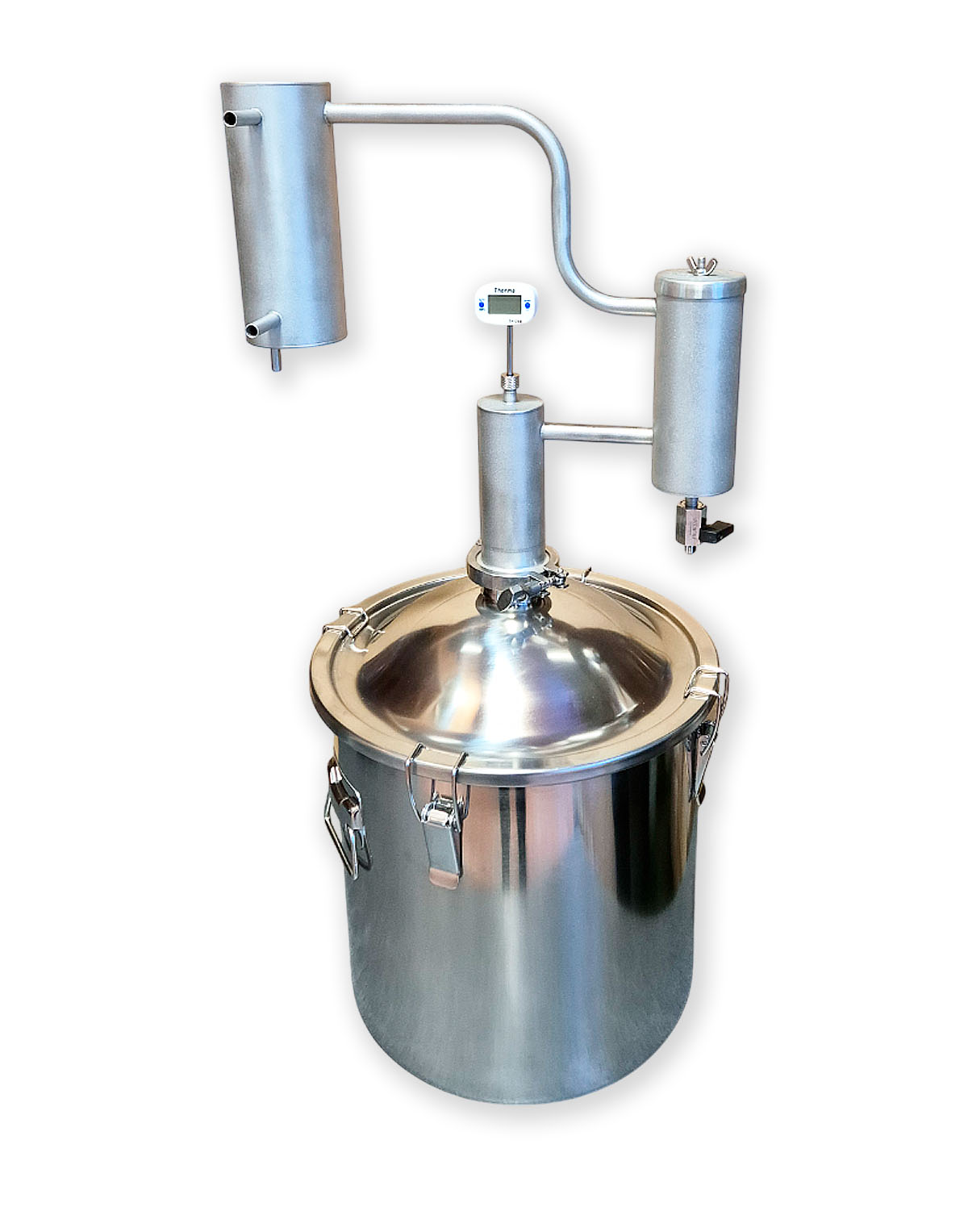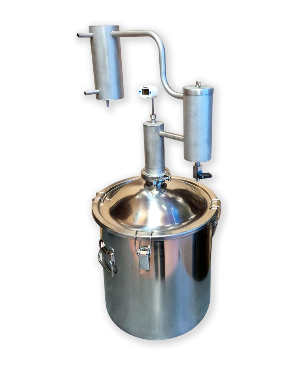 Die 14-Liter-Destillierblase (der Behälter) ist aus lebensmittelechtem Edelstahl AISI 304 (Wände und Deckel), AISI 430 (Boden) gefertigt.