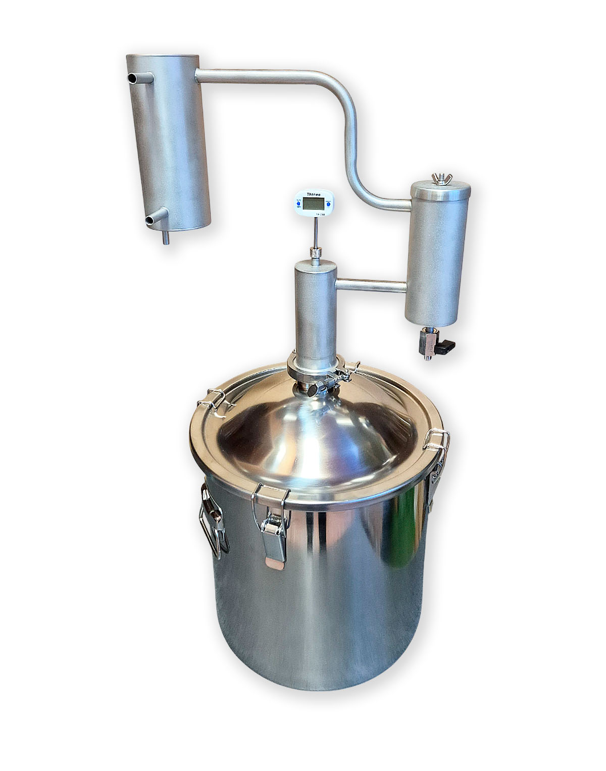Die 21-Liter-Destillierblase (der Behälter) ist aus lebensmittelechtem Edelstahl AISI 304 (Wände und Deckel), AISI 430 (Boden) gefertigt.