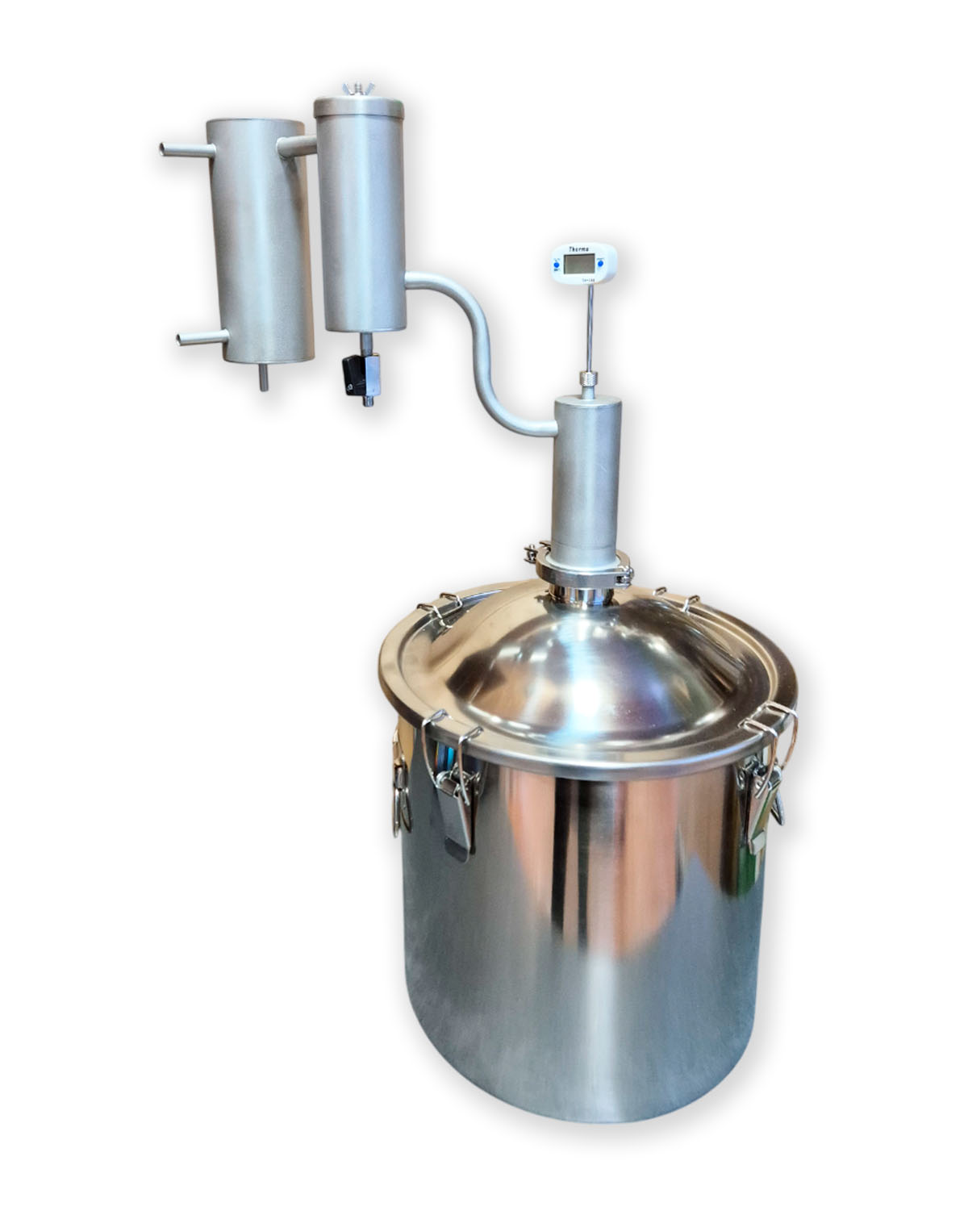 • Eigenständige Modifikationsmöglichkeit – 2″-Klemmverbindung (Schellenanschluss) gibt die Möglichkeit, andere Komponenten für die Destillation zu verwenden, z.B., eine zusätzliche Zarge, ein Diopter oder einen Alembik;
