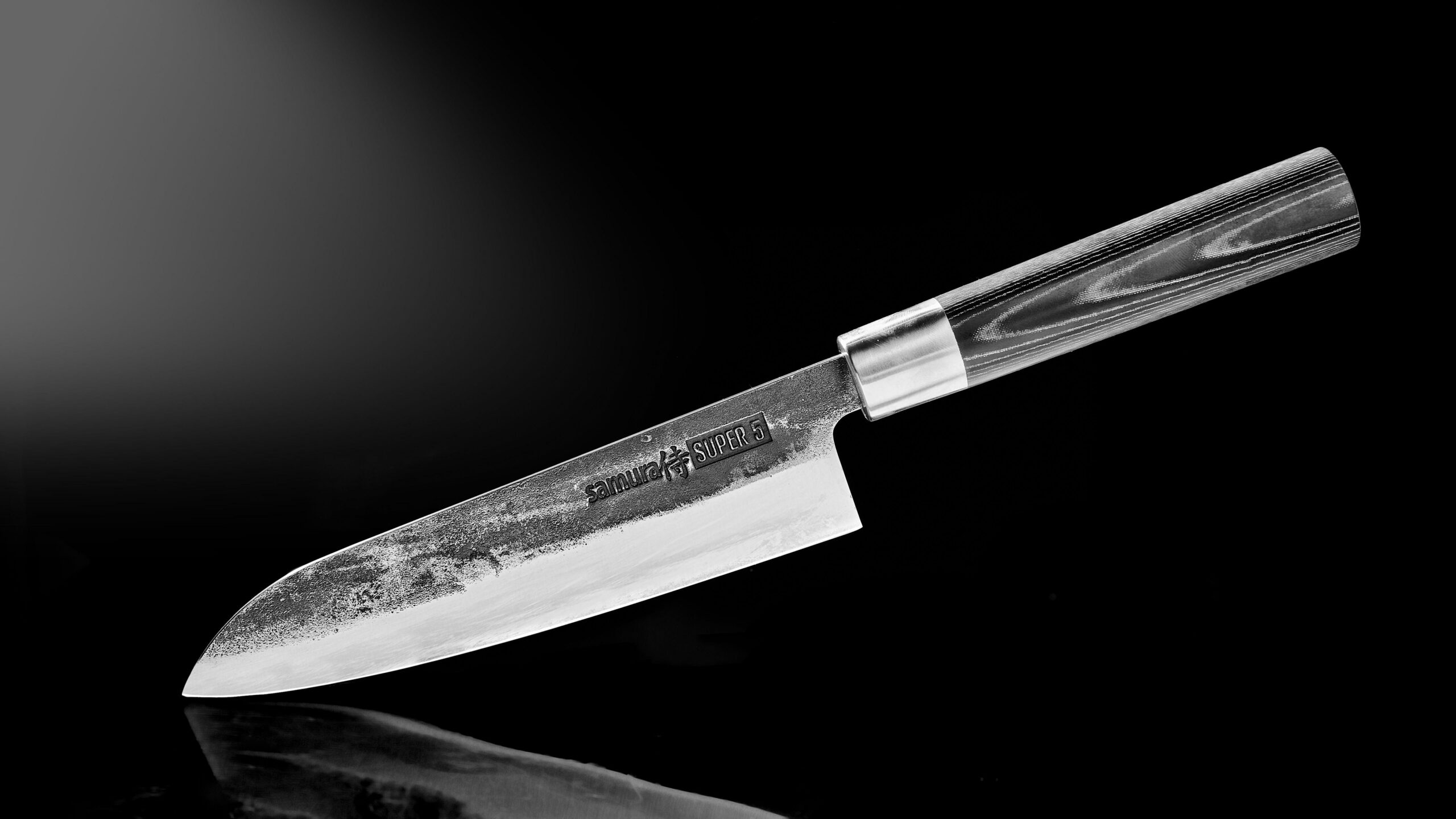 Das professionelle Messer Santoku Super 5 besteht aus hochwertigem japanischem Stahl VG-10 (Messerkern) und 4 Lagen Damast (Futter). In der Produktion durchläuft jeder Rohling einen aufwändigen mehrstufigen Bearbeitungsprozess, der aus dem Messer eine sehr scharfe, starke und langlebige Klinge macht.