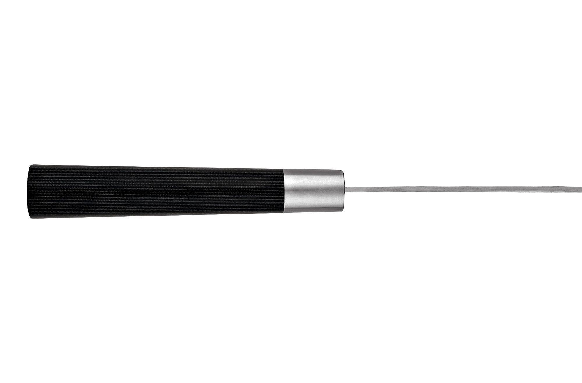 Japanese Chef Santoku Super 5 – Ein traditionelles Messer aus massivem Kohlenstoffstahl, handgeschmiedet und geschärft. Der Hauptzweck ist das Hacken von Gemüse, das Schneiden von Fleisch, Fisch usw. Und mit diesem Messer können Sie in der Küche fast alles machen, außer Knochen hacken und gefrorene Lebensmittel schneiden. Die spezielle japanische Form der Santoku-Klinge ermöglicht es Ihnen, das Küchenmesser auf dem Schneidebrett zu schwingen, weniger Kraftaufwand beim Schneiden aufzubringen und präziseste und dünnste Schnitte zu erzielen.