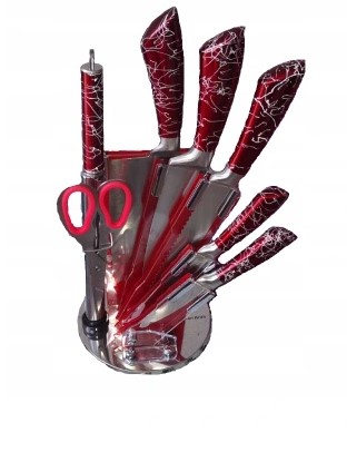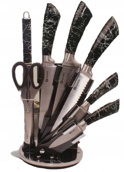 Das Messerset ist aus hochwertigem Edelstahl gefertigt. Messer sind viel widerstandsfähiger gegen Beschädigungen als Keramikmesser. Das Set enthält auch einen Spitzer und eine Küchenschere. Im Set enthalten ist ein praktischer, drehbarer Ständer.