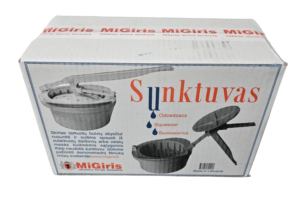 Der Entwässerer für geriebene Kartoffeln passt zur MiGiris Kartoffelreibe. Er kann verwendet werden, um Kartoffeln oder anderes Gemüse zu entwässern und Saft aus der geriebenen Masse zu pressen.