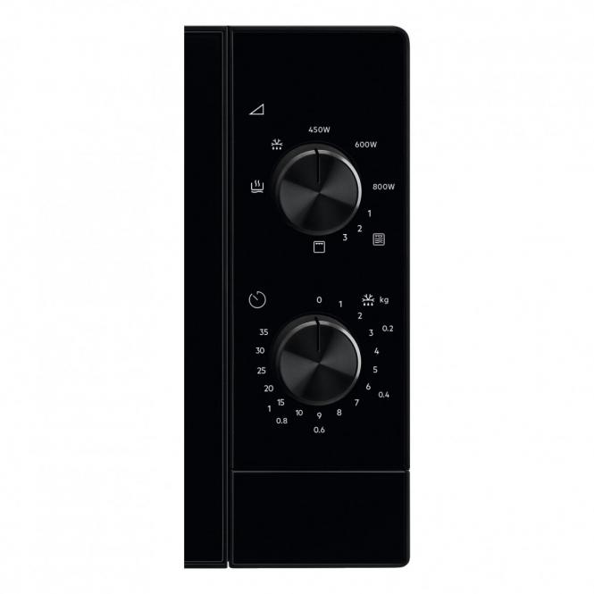 Vergessen Sie komplizierte elektronische Menüs und unzählige Tasten. Diese Mikrowelle wird mit zwei einfachen und zuverlässigen Drehknöpfen bedient: