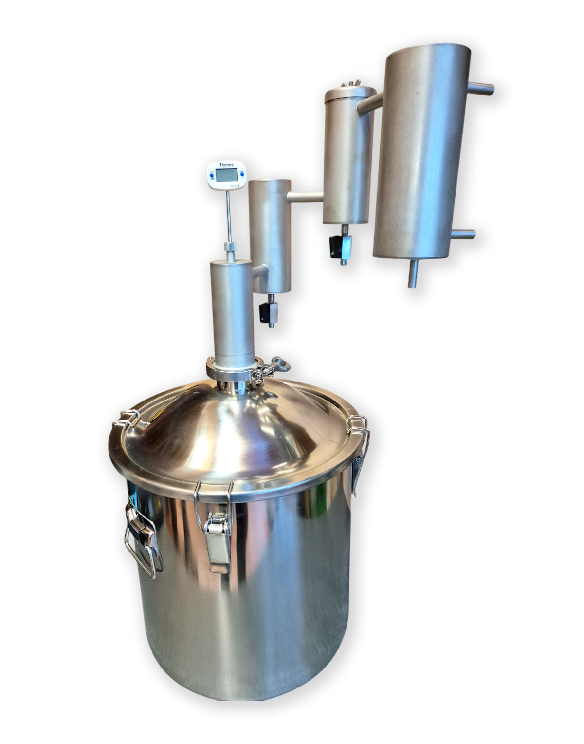 • Eigenständige Modifikationsmöglichkeit – 2″-Klemmverbindung (Schellenanschluss) gibt die Möglichkeit, andere Komponenten für die Destillation zu verwenden, z.B., eine zusätzliche Zarge, ein Diopter oder einen Alembik;