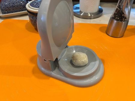 Herstellung: Bestreuen Sie das Gerät mit Mehl, legen Sie den ausgerollten Teig darauf, geben Sie die Füllung hinein und drücken Sie den Griff.