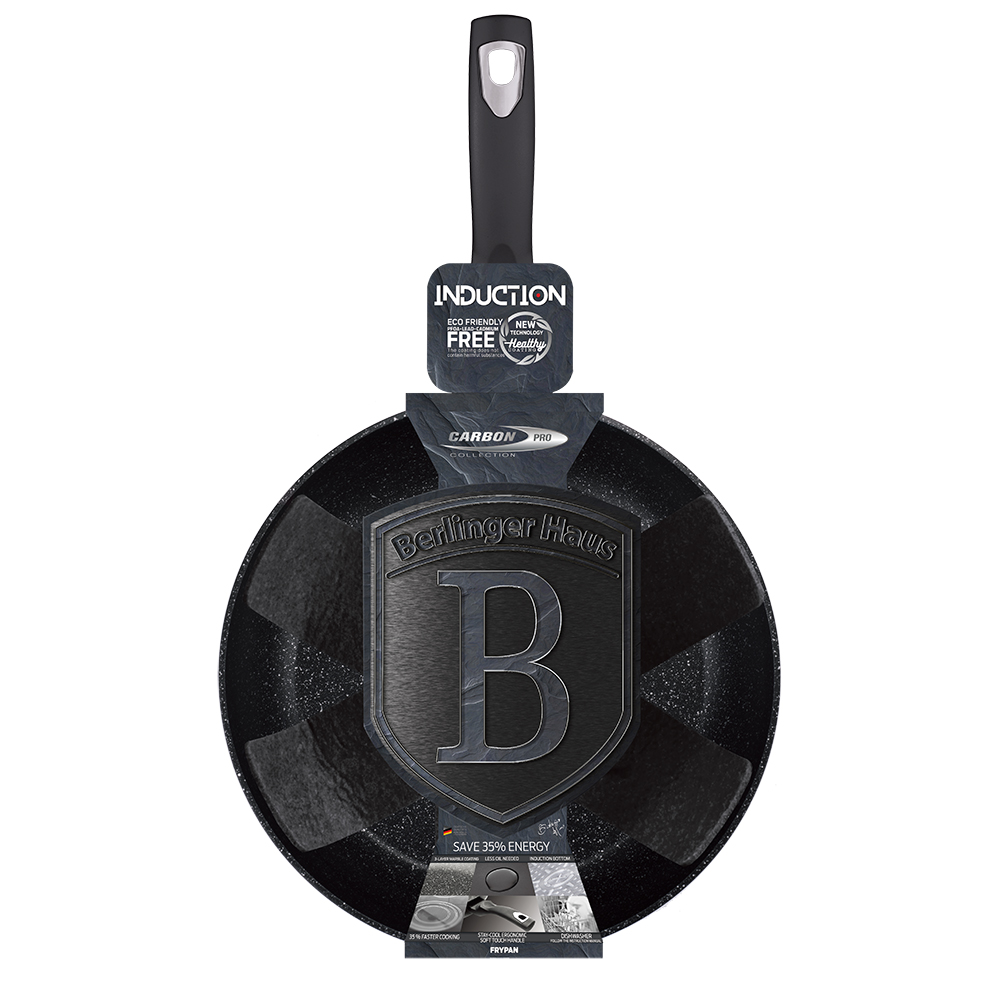 Diese elegante Berlinger Haus Pfanne aus unserer Carbon Pro Kollektion ist aus einem geschmiedeten Aluminiumgehäuse und einer 3-Schicht-Marmor-Antihaftbeschichtung hergestellt.
