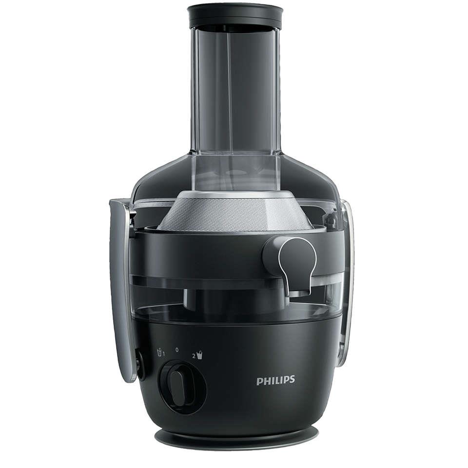Leistungsstarker Zentrifugalentsafter für die schnelle Entsaftung verschiedener Obst- und Gemüsesorten. Die FiberBoost Technologie ermöglicht die Wahl der Saftkonsistenz.