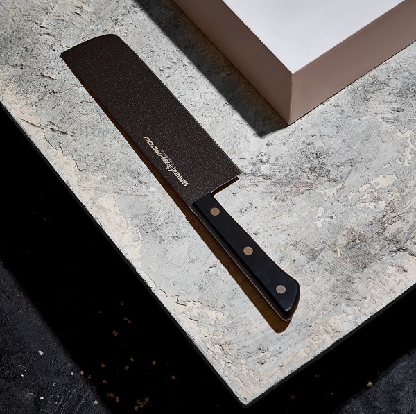 Die breite rechteckige Klinge des Messers ist mit einer speziellen schwarzen Anti-Rutsch-Beschichtung versehen. Es schützt den Stahl vor mechanischer Beschädigung und verhindert ein Anhaften des Produkts.