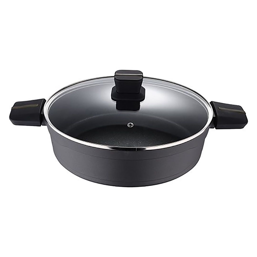 Ein breiter und vielseitiger 28-cm-Schmortopf, ideal für Pilaw, Eintöpfe, Gemüse- oder Fleischaufläufe. Durch den großen Durchmesser und die niedrigen Ränder ist das Umrühren und Servieren bequem.