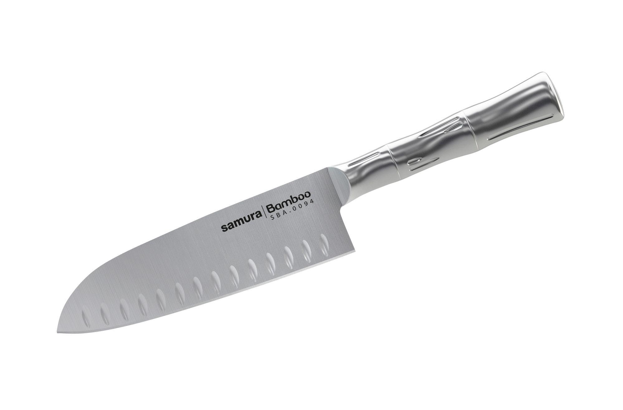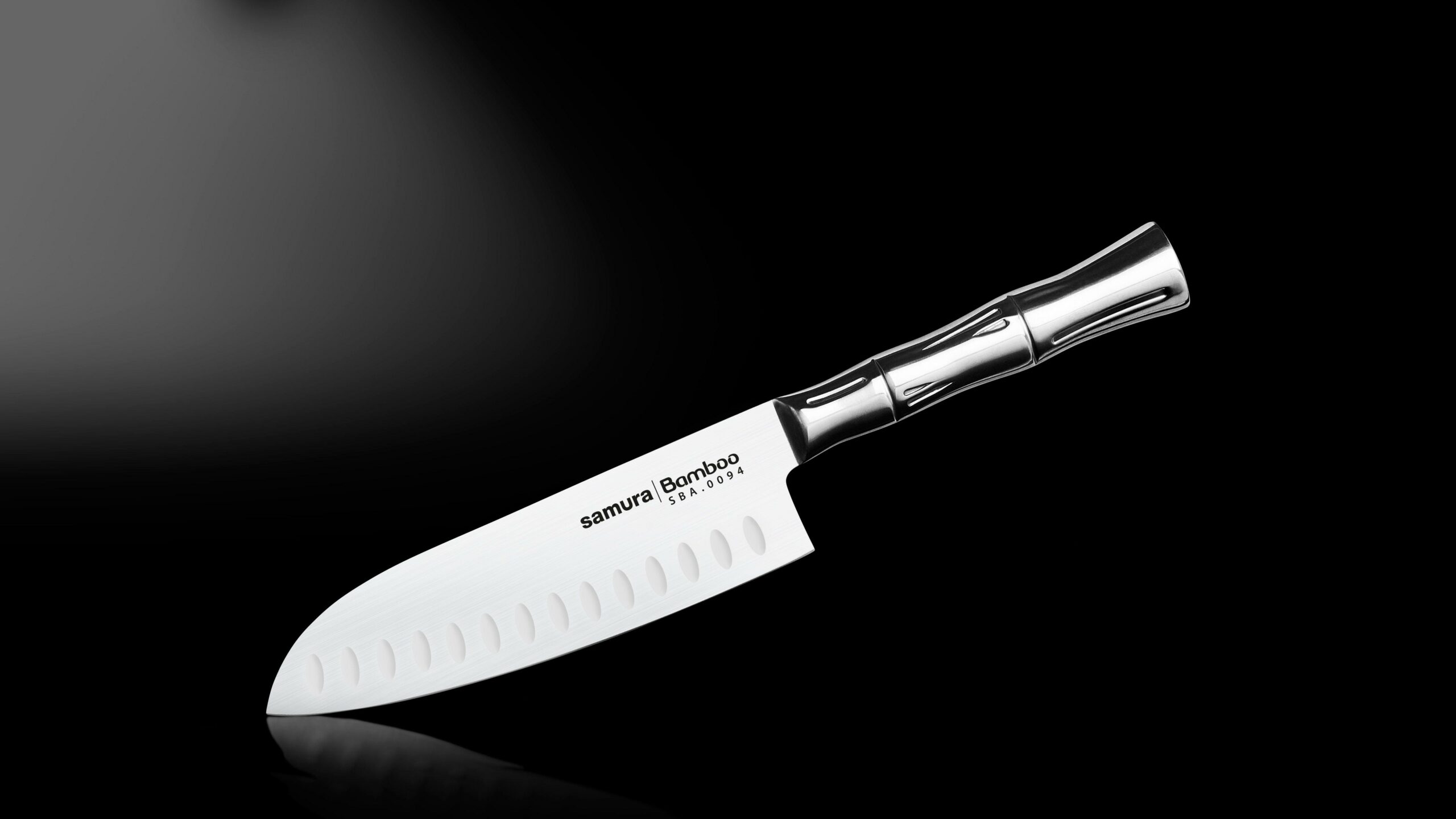 Das klassische japanische Santokumesser im Online-Shop Samura.ru zeichnet sich durch eine Reihe charakteristischer Details aus: