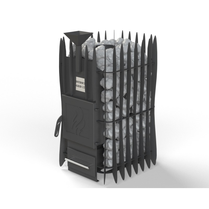 Der Saunaofen „Hotrockgrid12-SG-SN“ mit kurzer Brennkammer ist für die direkte Installation im Dampfraum konzipiert, wo das Holz aufgelegt wird, ohne die Sauna verlassen zu müssen. Die 150 kg Steinmasse erzeugt eine umhüllende Wärme, wodurch der Ofen sowohl für die klassische feuchte Sauna als auch für einen trockeneren Modus ideal ist.