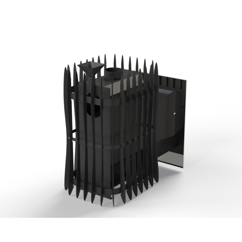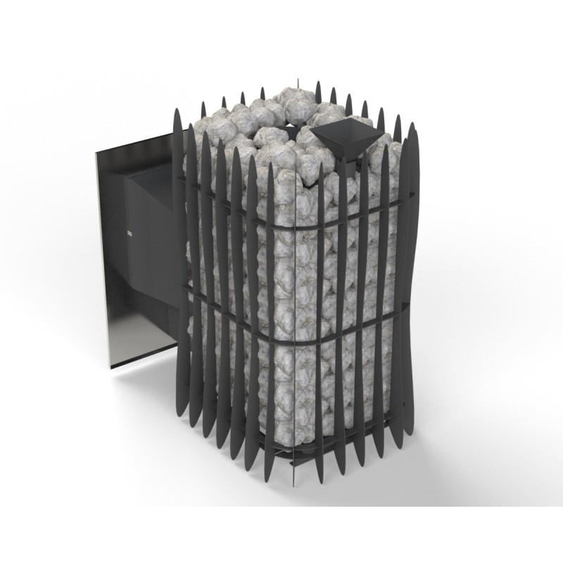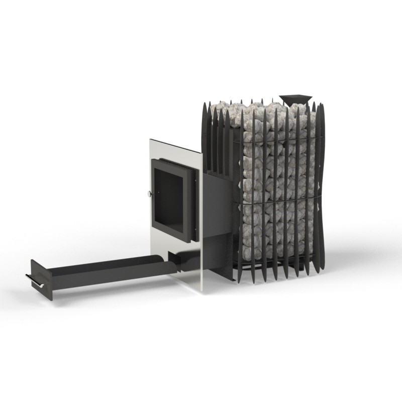 Der Saunaofen „Hotrockgrid12-SG-P“ ist für mittelgroße Saunen (6-12 $m^3$) konzipiert, bei denen der Ofen vom Nebenraum (durch die Wand) beheizt wird. Die 150 kg Steinmasse gewährleistet eine extrem lange Wärmespeicherung, sodass die Sauna noch lange nach dem Abbrennen des Holzes heiß bleibt und der Dampf fein und angenehm ist.