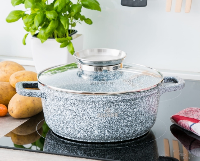 - Die Granit-Marmor-Beschichtung macht das Kochgeschirr besonders kratzfest und langlebig. Außerdem ermöglicht diese Art von Töpfen und Pfannen ein fettarmes Garen, da sich das Geschirr wie ein Stein erhitzt und die Hitze über die gesamte Fläche abstrahlt.
