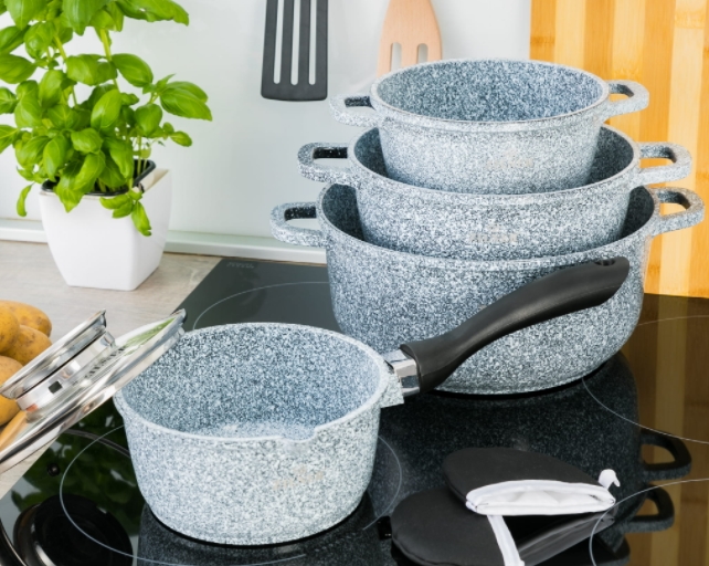 Ein Set aus 7 Pfannen aus einer Aluminiumlegierung mit einer Antihaft-Granitbeschichtung (imitiert Marmor), die mit einem nanotechnologischen Verfahren hergestellt wird, das eine extrem dichte, kompakte und glatte Schicht auf der Oberfläche erzeugt.