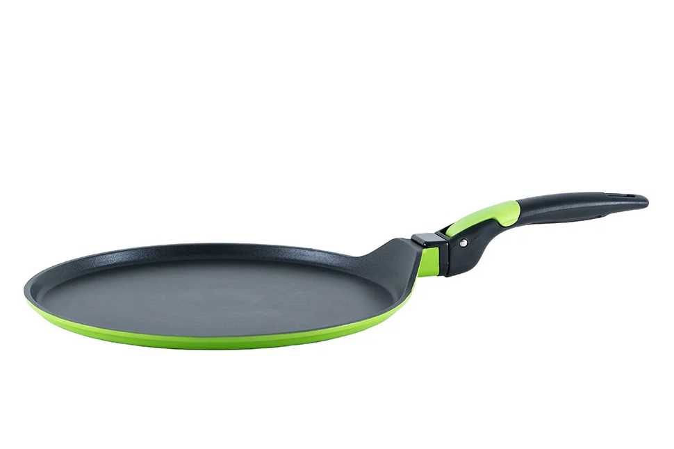 Spezielle Pfanne zum Backen von Crêpes, amerikanischen Pfannkuchen, Omeletts, Rührei. Die niedrigen Ränder erleichtern das Wenden und Herausnehmen des Gebäckes. Dank des abnehmbaren Griffs auch für im Ofen gebackene Pfannkuchen geeignet.