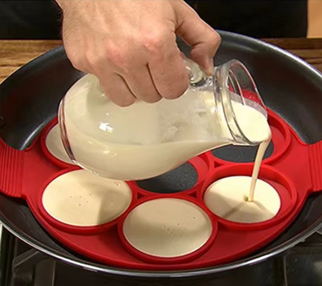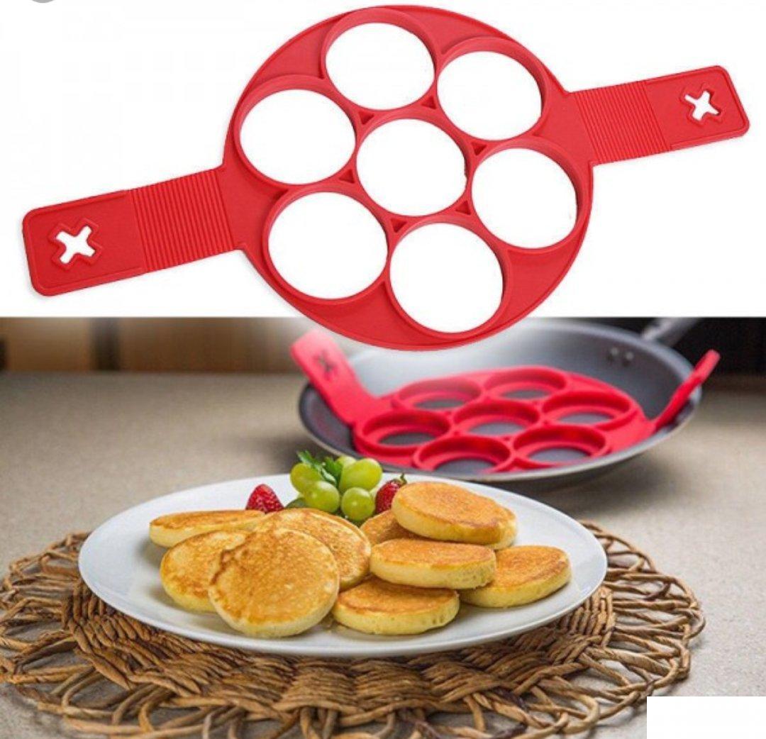 Wir präsentieren “Flippin’ Fantastic” – die revolutionäre Silikonform, die Ihre Frühstücksgewohnheiten verändern wird. Vergessen Sie das mühsame Wenden einzelner Pfannkuchen – mit dieser Form bereiten Sie 7 perfekt geformte Pfannkuchen auf einmal zu. Dank der speziellen Griffe ist es einfach und sicher, alle Pfannkuchen auf einmal zu wenden.