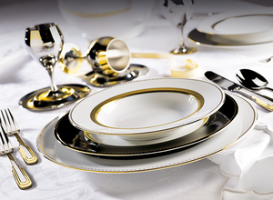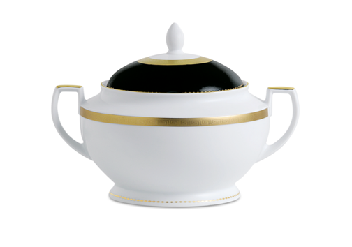 - Der “Black&White” Service ist eine gelungene Kombination aus Form und kontrastreichen Farben: Weißes Porzellan fungiert als glänzende Leinwand für das goldene geometrische Muster auf schwarzem Hintergrund. Diese Linie ist eine herausragende Interpretation klassischer und griechischer Ornamente sowie beruhigender Farben.